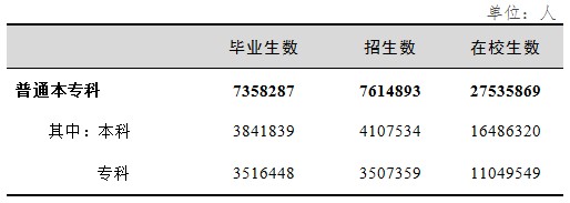 普通本專科招生761.49萬人,比上年增加12.88萬人,增長1.72%;在校生2753.59萬人,比上年增加57.74萬人,增長2.14%;畢業生735.83萬人,比上年增加31.65萬人,增長4.49%。