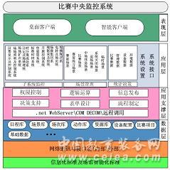 圖示是比賽中央集成管理系統(tǒng)的分層邏輯模型,整個邏輯結構由四級中間核心層、一個通訊接口體系、一