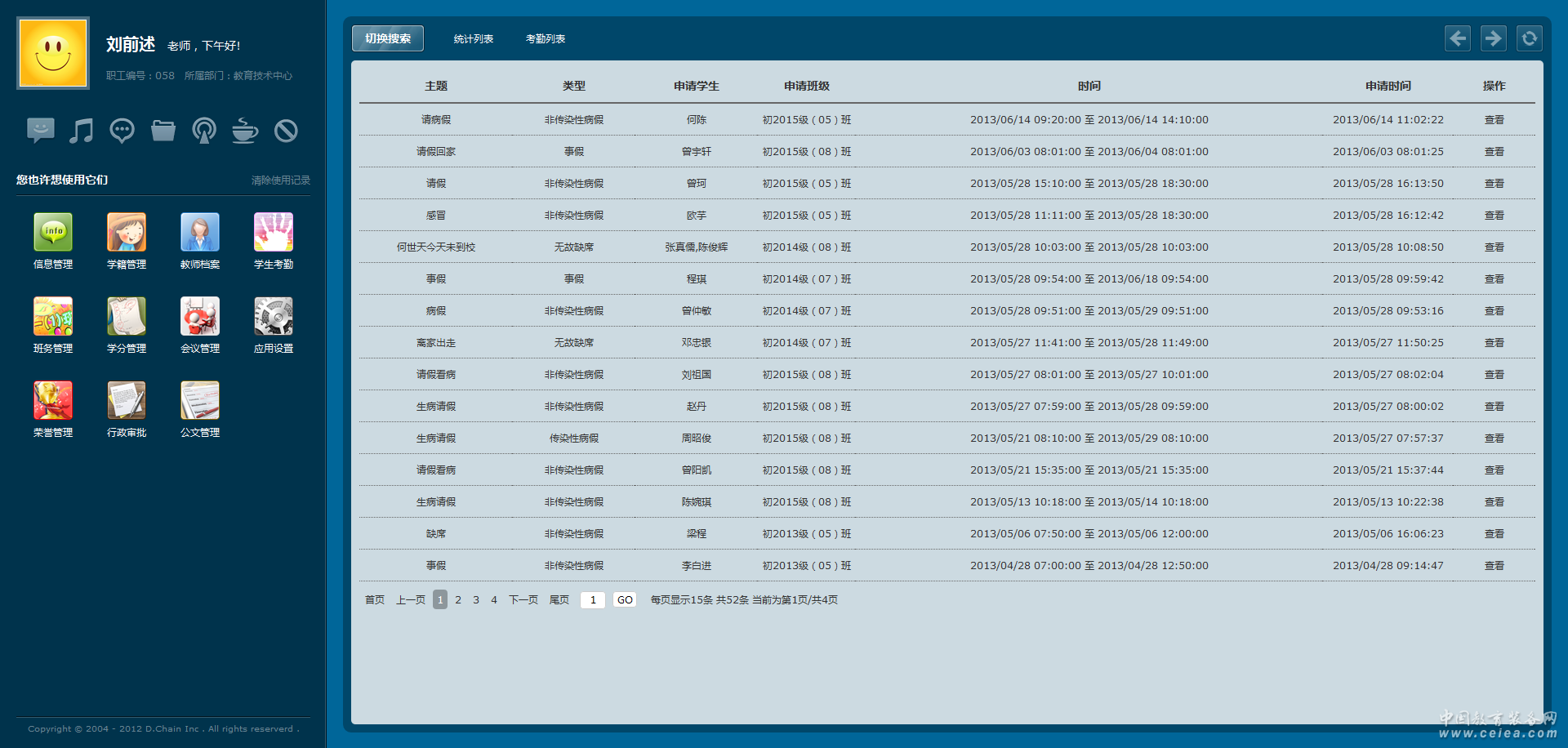 班級考勤 主要是通過靈活設置學生的考勤類型、每個年度學期中教學周考勤的實際安排情況(針對每個學期的考勤開始時間與結束時間靈活設置,然后自動生成對應的教學周,并針對放假和調休的情況進行靈活設置,實現考勤完全的符合實際的考勤情況),學生或者教師幫助學生進行考勤申請的提交,并交由專門的負責考勤的人員進行考勤審核及匯總。 住宿考勤 主要是通過靈活設置考勤類型,學生或者教師將學生的考勤申請提交給宿管員進行審核的考勤過程,學生的每個年度學期的考勤申請提交給對應年度學期的公寓宿管人員。 考勤機對接 該功能主要是通過采用和考勤機數據對外接口對接的方式對考勤機進行對接,同時云平臺可以控制針對那些考勤機進行考勤數據的采集,同時根據對考勤數據的條件限定,以及數據接口的轉化機制,將考勤數據自動進入云平臺。 考勤統計分析 主要是針對每天、每月、每個學期以及時間段對學校中各個年級下的各個班級中考勤的應到人數、實到人數以及班級中的考勤詳細進行統計分析,同時針對考勤的分析結果生成相應的考勤報表。 家長監管 主要是根據某個時間段的學生考勤情況有選擇性的下發給家長,可以采用短信的方式,也可以再家校通中進行發送,同時家長給出相應的反饋信息。 |