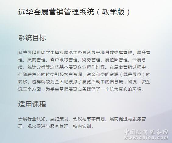 產品詳細介紹系統目標 系統可以幫助學生模擬展覽主辦者從展會項目數據庫管理、展會管理、展商管理、客戶跟蹤管理、財務管理、展位圖管理、會展總結、統計分析等這些基本展覽企業運作過程。在展會營銷過程中,伴隨著角色的轉變引起客戶資源、資金和空間資源(既是展位)的轉移。這樣就較為全面地模擬了展覽活動中的信息流,物流,資金流三個方面,為學生掌握展覽實務提供了一個較為真實的環境。