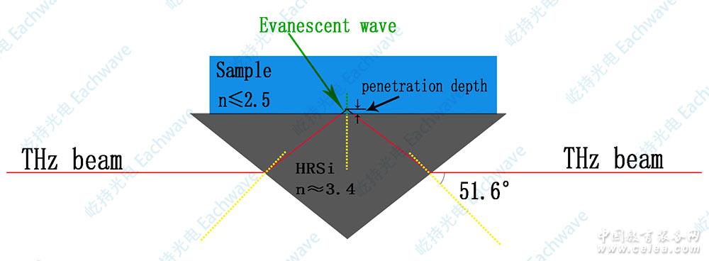 產品詳細介紹產品簡介 太赫茲是近年來科研領域一個非常熱門的研究方向,太赫茲時域光譜測試技術則是一門新興的正在蓬勃發展的技術。目前國內外物理學、光學相關領域的科研實驗室大多已經裝備了太赫茲時域光譜測試設備,進行超材料、半導體材料等的研究。然而太赫茲光譜很具特色的生物大分子識別特性卻很少得到真正的實際應用。 Eachwave推出的太赫茲衰減全反射測試模塊,主要針對含水量多的細胞、組織等樣品,可以通過衰減全反射的方式測試出樣品對太赫茲波譜的吸收譜。可以真正的將太赫茲波譜的生物大分子指紋識別特性應用于生物樣品的分析測試中去。讓更多人的生物科研用戶多了一個新型的強而有力的樣品分析研究手段。 太赫茲衰減全反射測試,專門用于測試對入射的太赫茲光譜具有強烈吸收的樣品。太赫茲波段的衰減全反射模塊核心部件是一塊高阻硅(HRSi)棱鏡,HRSi在太赫茲波段(0.1-4THz)具有平坦且很高的折射率,在0.1-4THz,HRSi折射率約為3.416。 如下圖所示,太赫茲光束經過高折射率的高阻硅(HRSi)棱鏡,入射到小折射率的樣品上,在樣品與高阻硅(HRSi)界面全反射,此過程中,太赫茲(THz)光束會在樣品中有一定的穿透深度,即全反射過程中產生的倏逝波會在樣品中傳播一段距離并最終攜帶樣品的信息反射出來。通過這種方法可以測試對太赫茲波吸收強烈、不能用常規透射或反射方法測試的樣品(如生物樣品、細胞蛋白質等)。