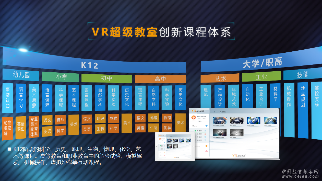 產品詳細介紹VR超級教室是什么? AR/VR超級教室將虛擬現實技術與教學相融合,以優質教學資源為核心,集終端、應用系統、平臺、內容于一體,將抽象的概念情景化,為學習者打造高度仿真、沉浸式可交互虛擬互動學習場景的一體化解決方案。 VR超級教室有望解決當下教育難點,前景廣闊 傳統意義上的教育,學生學習更多是一種強制記憶的過程,學生不易提興趣,許多知識點抽象,不易被學生理解,學生被動學習居多。還有,因為學生個體想象能力不均,想象能力豐富的學生理解抽象的概念較容易,而想象力欠缺的同學會稍弱,造成教育的不公平。另一方面,老師在準備教綱的時候即使準備了大量的圖文、視頻等材料也難保證內容的生動直觀。而這一切使用VR超級教室,就可以在很大程度上解決。“VR超級教室”讓學習知識變成一個沉浸于虛擬空間里的“體驗之旅”,對于學習興趣的提升、知識難點的理解、創新思維的擴展……都將是全新的改變。 揭秘VR超級教室的構成 此項目已經形成了完整的產品生態體系:硬件系統集成、云端分發平臺、課程體系開發、教研資源整合。 VR超級教室從硬件上包括以下幾個硬件構成:智慧黑板、超級上課系統電腦、控制學生頭顯的VR控制器,學生端每個學生配備一個IPAD及VR頭盔。 課程體系開發 VR超級教室提供的課程分為 K12階段的科學、歷史、地理、生物、物理、化學、藝術等課程。高等教育和職業教育中的危險試驗、模擬駕駛、機械操作、虛擬沙盤等互動課程。素質教育中的常識普及和模擬地震、火災等課程。 不同的教學場景,內容制作形式也不同:K12 階段,黑晶通常提供自制標準課程,向學校提供的是一體化訂單服務;另外,與各大名校合作成立 AR/VR 教學實驗中心,邀請名校名師參與課程制作,打造定制服務。大學和職業教育階段,黑晶提供的則是定制化訂單。根據不同學校的不同專業(例如建筑設計、環境、城市規劃等專業學科),量身定制 AR/VR 課程。而素質教育階段,黑晶則與科技館、地震館等這類科普機構合作,聯手制作內容。 一鍵式硬件方案的搭建,可操作的VR課程,并且為老師提供實操培訓,實現備課上課無縫操作。 Super class 云平臺 Super class 云平臺提供優質VR教育內容資源,支持PC和移動終端。 1、以內容為核心,以市場為導向一方面,廣泛吸納 VR 內容團隊,鼓勵高素質教師、科研人員的參與;另一方面,快速鋪開市場,解決學校痛點,培養老師和學生的 VR 習慣。 2、開放的硬件和系統打造蘋果 app store 式的平臺(www. vrsuperclass.com),允許開發團隊上傳優質內容;而針對第三方硬件及系統,只要通過特定檢測后,便可在平臺進行推廣; 3、外包的服務針對教師的 VR 培訓、VR 夏令營,可與外包服務團隊合作。 VR超級教室落地實施 VR超級教室不是一個概念,而是已經在青島實驗高中落地實施,同步,與北京、上海、廣州、長沙、青島……等城市重點實驗學校正在落地“VR教研樣板基地”將VR與教學一線緊密捆綁,打造真正匹配“科教研學”需求的解決方案。 打造AR/VR教育全體系生態圈 此項目已經形成了完整的產品生態體系:硬件系統集成、云端分發平臺、課程體系開發、教研資源整合。下一步,將針對K12課本教材、高職校創新科教、實踐素質教育等幾大板塊,匯聚更多智能硬件、教育資源、渠道合作方構建更完備的生態圈,共同推進“VR教育”產業的研發與應用。