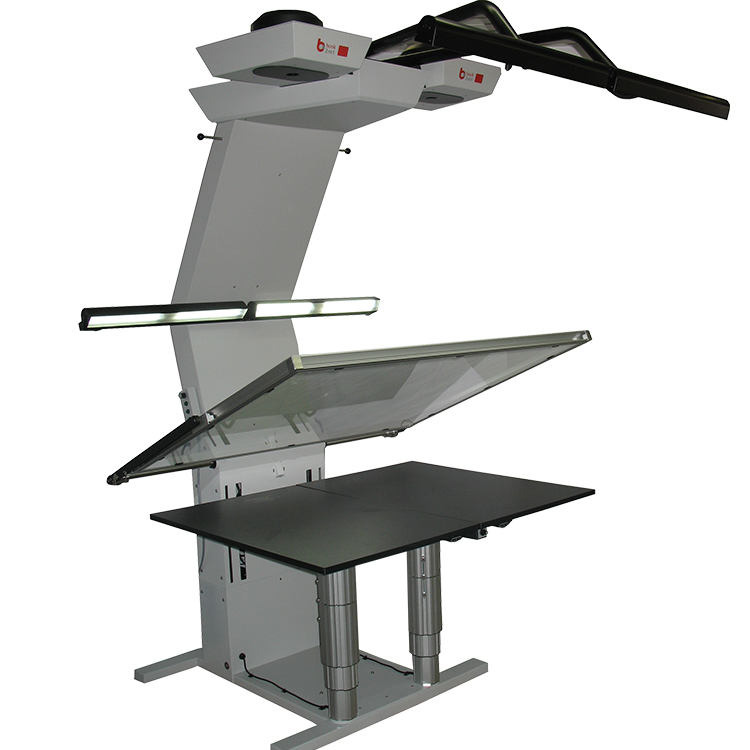 紫外線/紅外線和無臭氧照明系統。光照低于 2,500 lux,滿足保護生態要求。照明裝置開發的菲涅爾透鏡是比其他制造商的照明設備具有顯著的技術優勢。它們確保完美的光分布和照明。避免了不需要的和破壞性的漸變和反射效果,否則會在非常亮或非常暗的區域以及閃亮的材料中出現。 PLC 控制的電動升降柱可將書臺的調節至 25 厘米,如果需要,可精確調節至 40 厘米。它們每個高達 180 公斤的負載能力而設計,可輕松支持非常厚重的掃描。由于集成了微傳感器,它們可以使用手和腳控制進行操作。因此,Hornet 不僅為大幅面文檔和沉重的書籍提供了極其溫和的記錄概念,而且還具有無與倫比的用戶友好性,滿足現代、符合人體工程學的工作場所的要求。