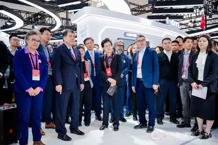 國家會展中心(天津)11號館內,北京金三惠展位內來自各地的領導、教育工作者齊聚一堂,以其最新的AI科技成果,吸引了眾多觀眾駐足體驗。