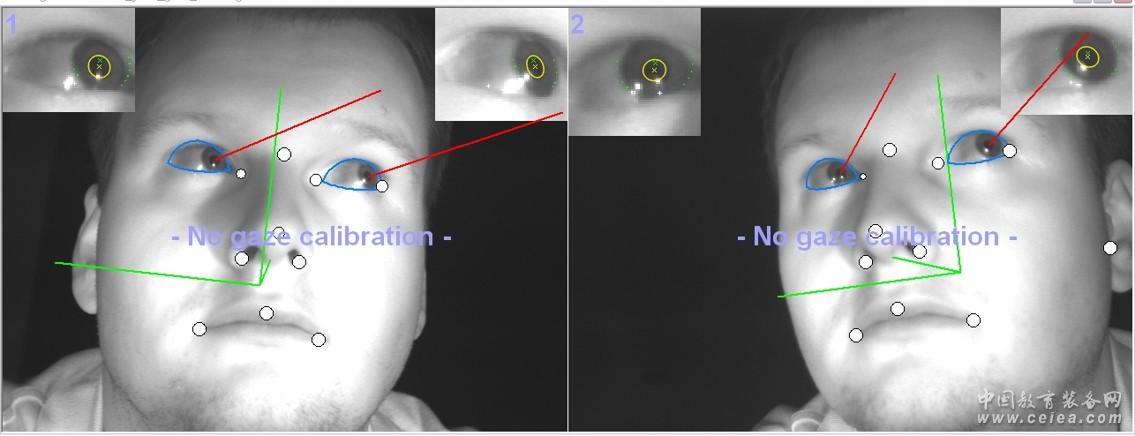 3D 模式真實模擬 Smart Eye能夠精確測算頭部的三維位置和方向。系統(tǒng)通過跟蹤一系列帶有面部特征的圖像,然后匹配這些特征點到3D頭部模型上。通過對虹膜和瞳孔的檢測和定位,并參照已經(jīng)標(biāo)定過的眼睛幾何模型來確定觀測者的視線的方向。同時眼皮也被定位,另外通過使用眼部的3D模型確定上下眼皮的距離。最后確定瞳孔直徑。