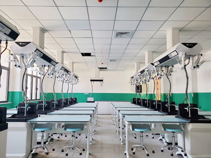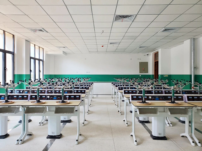 童園科技為山西省萬榮中學建設完成系列實驗室28間,涵蓋化學實驗室、物理實驗室、生物實驗室、化學準備室、物理準備室和生物準備室等。此次實驗室建設均采用童園T系列學生實驗桌,整體鋁鋼結構,采用壓鑄材料一次成型,材料經過防腐氧化處理,具有較強的耐腐蝕及承重性,另外根據學科實驗用水、用電、通風等需求,搭配自適應排放式學生實驗水柜、多功能數控學生電源、塔吊等產品。
