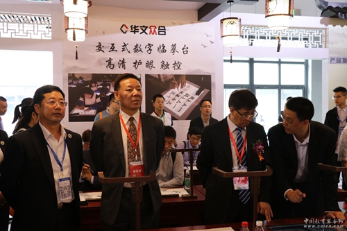2018年5月11日上午,四川省教育廳巡視員劉東、四川省教育裝備行業協會會長張林祥等一行,到展區巡視。行至8號館北京華文眾合科技有限公司展位,四川省教育廳巡視員劉東對華文眾合“智云+”數字書法教室產生了濃厚的興趣,并親自體驗了數字書法臨摹。