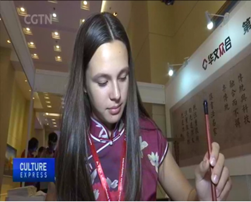 報道中,美國圣地亞哥州立大學孔子學院的卡米拉在體驗華文眾合智慧書法教室