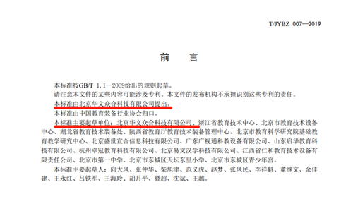 《中小學智慧書法教室裝備規范》團體標準由華文眾合提出,由中國教育裝備行業協會歸口,主要起草單位有北京華文眾合科技有限公司、北京市教育技術設備研究中心、浙江省教育廳教育技術中心、湖北省教育廳教育技術裝備處、陜西省教育廳教育技術裝備管理中心、北京市教育科學院基礎教育教學研究中心、北京市一中及多個中小學及多個行業內的廠商。