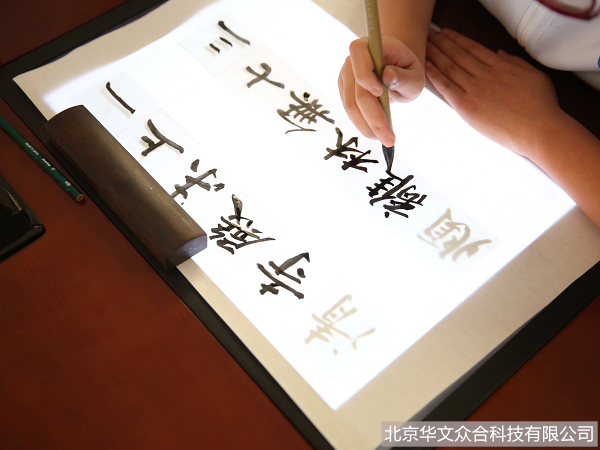 這只是智慧書法平臺的眾多功能中的一個。在這個類似于大型書桌的平臺上方,有一個攝影儀,會清晰記錄書寫者寫字時筆勢的走位,如果是在課堂,任意一名學生的書寫動態都可由老師同步到教師端和大屏,老師可以對其進行針對性點評,學生觀摩學習會更加方便直觀。而老師的書寫示范高清,也能同步傳輸到每一名學生的交互式數字臨摹臺,老師的筆尖寫到哪里,鏡頭就跟蹤到哪里,學生可以看清楚老師書寫的每一個細微變化。