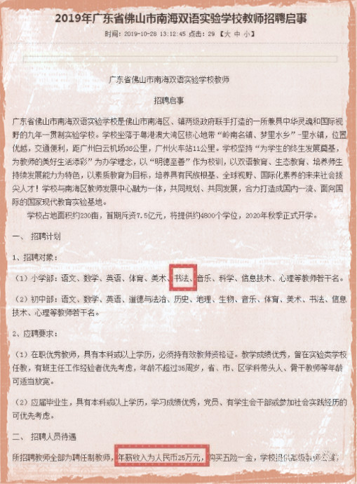 2019年10月佛山市南海雙語實驗學校的教師招聘啟事,小學部和中學部都招聘書法老師,年薪25萬元人民幣、購買五險一金、提供高級教師公寓。