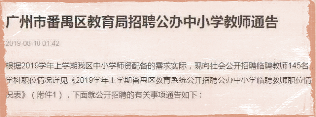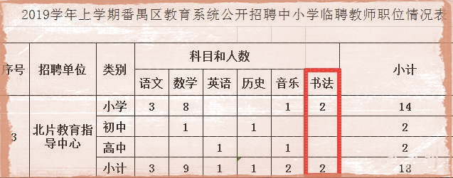 廣州市番禺區教育局2019年8月招聘公辦小學書法教師。