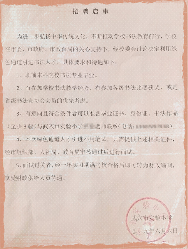 2019年6月,湖北省首家“蘭亭書法學校”武穴市實驗小學招聘書法教師,應聘者免除筆試,只需提供相關證件進行面試,錄用考核合格后即可轉為財政編制,享受財政供給人員待遇。