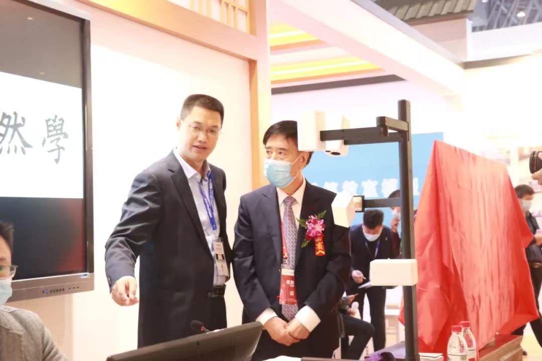 教育部關心下一代工作委員會常務副主任、中國教育裝備行業協會會長王富(左一),華文眾合董事長向大鳳(右一)為新產品揭牌