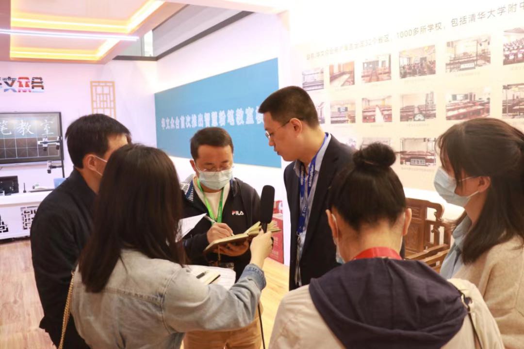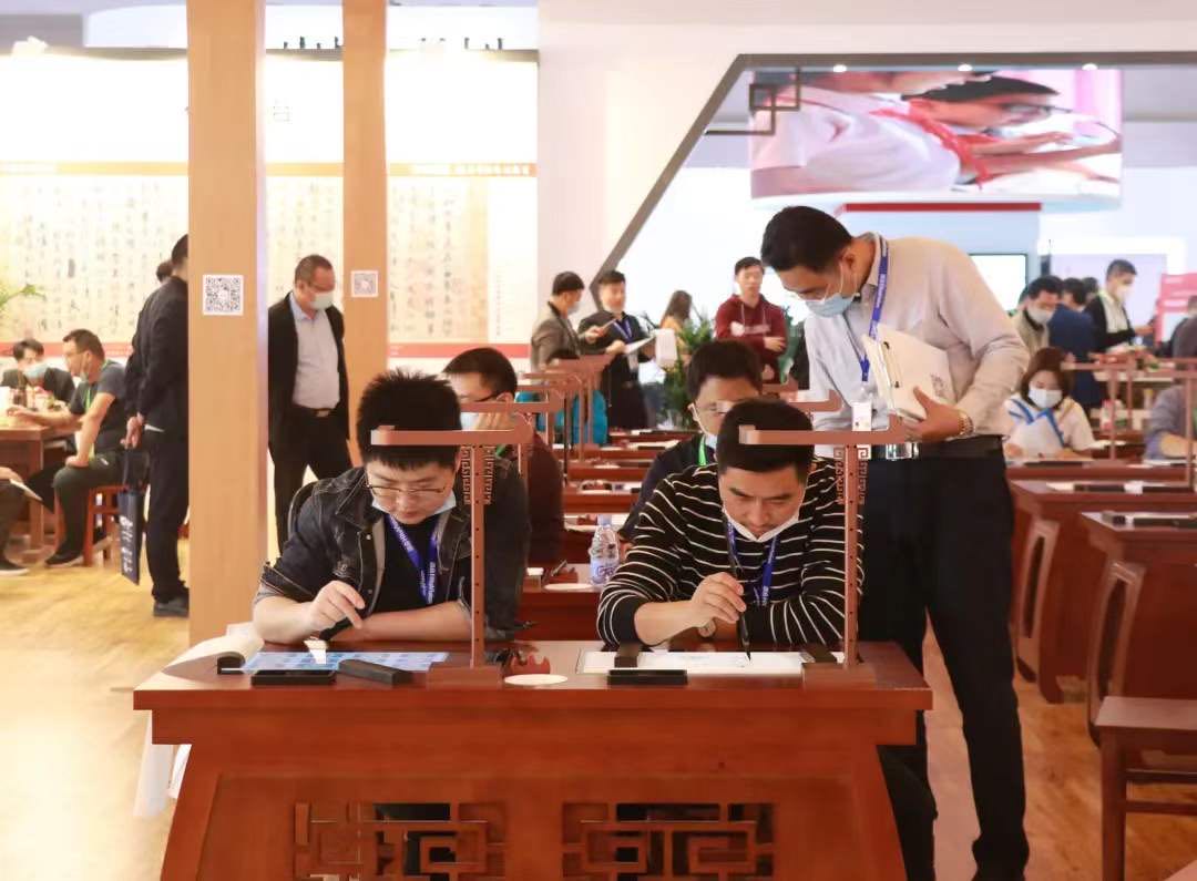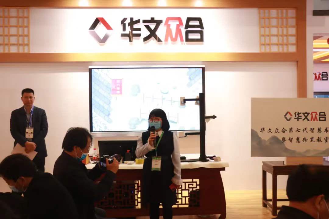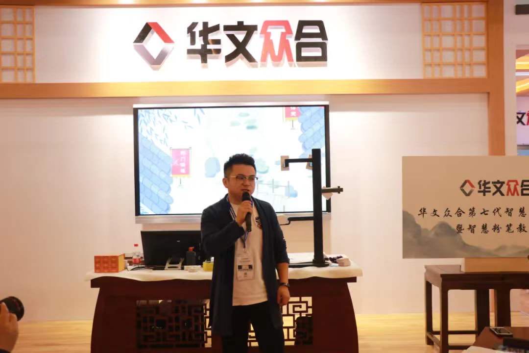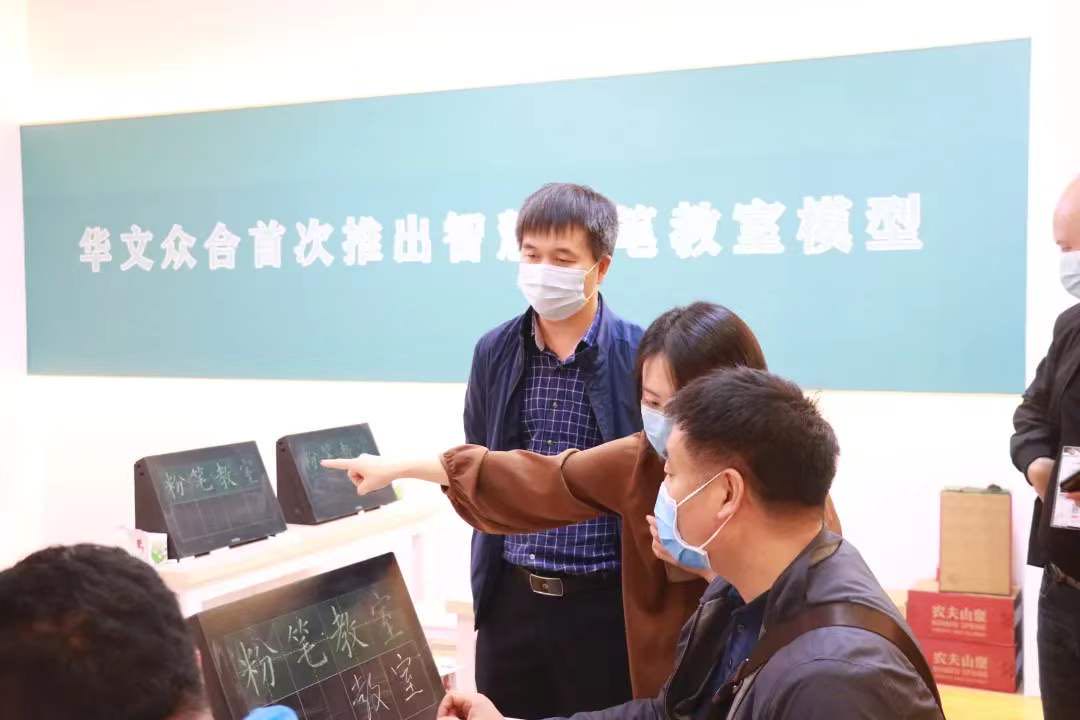 華文眾合展位參觀者認真聽取第七代智慧書法教室講解并參與互動