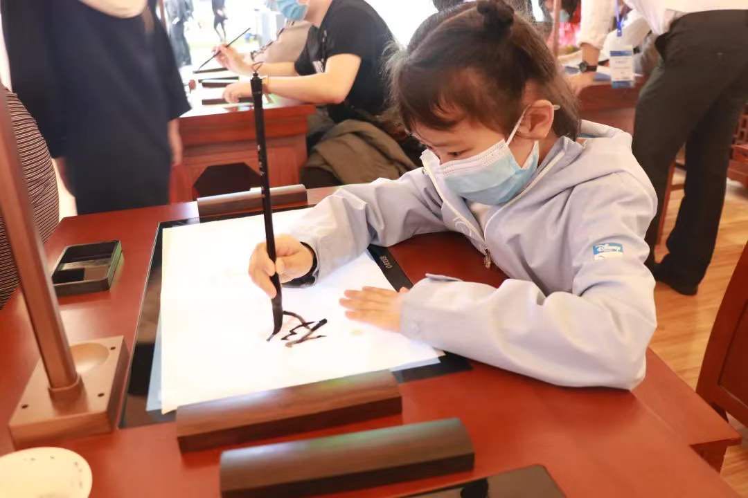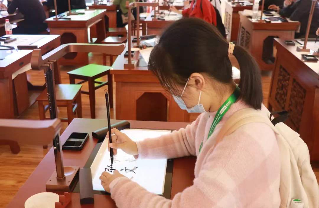 參觀者認真體驗第七代智慧書法教室