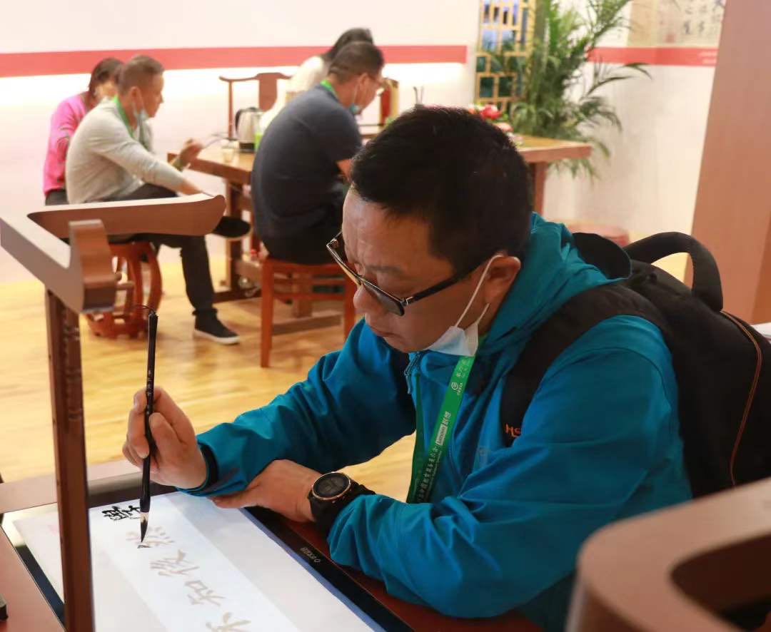 參觀者展示書法作品
