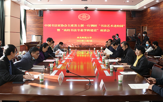 2020年11月9日,全國政協(xié)書畫室副主任、中央文史館館員、中國書法家協(xié)會主席蘇士澍,中國藝術(shù)研究院原院長、中共甘肅省委原常委、宣傳部長連輯,中國書法家協(xié)會會員、中央電視臺書畫家協(xié)會副主席兼秘書長樓建軍,中央電視臺編導(dǎo)王淳晨,甘肅省文聯(lián)黨組成員、副主席馬青山,中國書法協(xié)會原副主席、甘肅省書法家協(xié)會名譽主席張改琴,甘肅畫院原院長、省文史館館員馬國俊等一行到西北師大調(diào)研“書法藝術(shù)進校園”暨“高校書法專業(yè)學(xué)科建設(shè)”情況,交流學(xué)校書法專業(yè)學(xué)科的建設(shè)情況,分享教師在教學(xué)、科研和創(chuàng)作上的心得和成果,共同探討書法專業(yè)在師范教育中對民族文化傳承培根鑄魂的價值和意義。