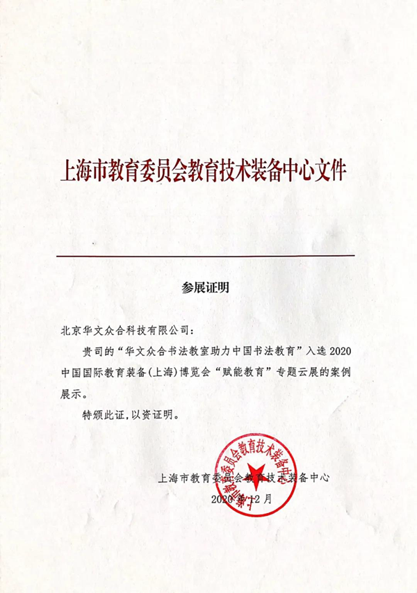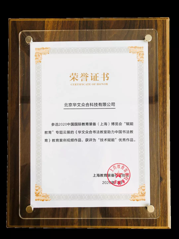 參選2020中國國際教育裝備(上海)博覽會(huì)“賦能教育”專題云展的《華文眾合智慧書法教室助力中國書法教育》教育案例視頻作品,獲評(píng)為“技術(shù)賦能”優(yōu)秀作品