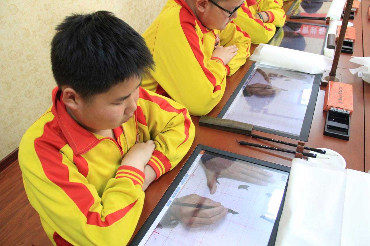 北京一中暨超老師通過智慧書法教室給學(xué)生們上了一節(jié)基于北師大版教材的《點(diǎn)畫》現(xiàn)場觀摩課。首先,暨老師通過智慧書法教學(xué)系統(tǒng)的字帖排版,排列了各種書體的點(diǎn)畫電子字帖,分析點(diǎn)畫的形態(tài)特征;通過系統(tǒng)的視頻資源庫平臺(tái)調(diào)取了各種書體的多種點(diǎn)畫專家書寫視頻,引導(dǎo)學(xué)生通過觀察、觀看名家示范;隨后,暨老師還通過多目書畫教學(xué)展示臺(tái),給學(xué)生從多個(gè)視角做了現(xiàn)場書寫示范,學(xué)生通過交互式數(shù)字臨摹臺(tái)近距離的觀察暨老師書寫時(shí)的運(yùn)筆細(xì)節(jié);同時(shí)還進(jìn)行了基于點(diǎn)畫的單字“玉”字的學(xué)習(xí),從智能課程平臺(tái)展示了基于“玉”字的筆順動(dòng)畫、行筆路線、書體對(duì)比等方面;最后,暨老師讓學(xué)生對(duì)授課所學(xué)的點(diǎn)畫例字,進(jìn)行臨摹練習(xí),其中運(yùn)用了“邊看邊練”和“六步臨摹教學(xué)法”,練習(xí)的過程和結(jié)果,通過學(xué)生端的互動(dòng)系統(tǒng),直播到大屏和學(xué)生端的交互式數(shù)字臨摹臺(tái),進(jìn)行實(shí)時(shí)的點(diǎn)評(píng)和糾錯(cuò),最終實(shí)現(xiàn)了信息化技術(shù)跟傳統(tǒng)書法教學(xué)的有效結(jié)合,大大的激發(fā)了學(xué)生的學(xué)習(xí)興趣,提升了教學(xué)效率和效果。
