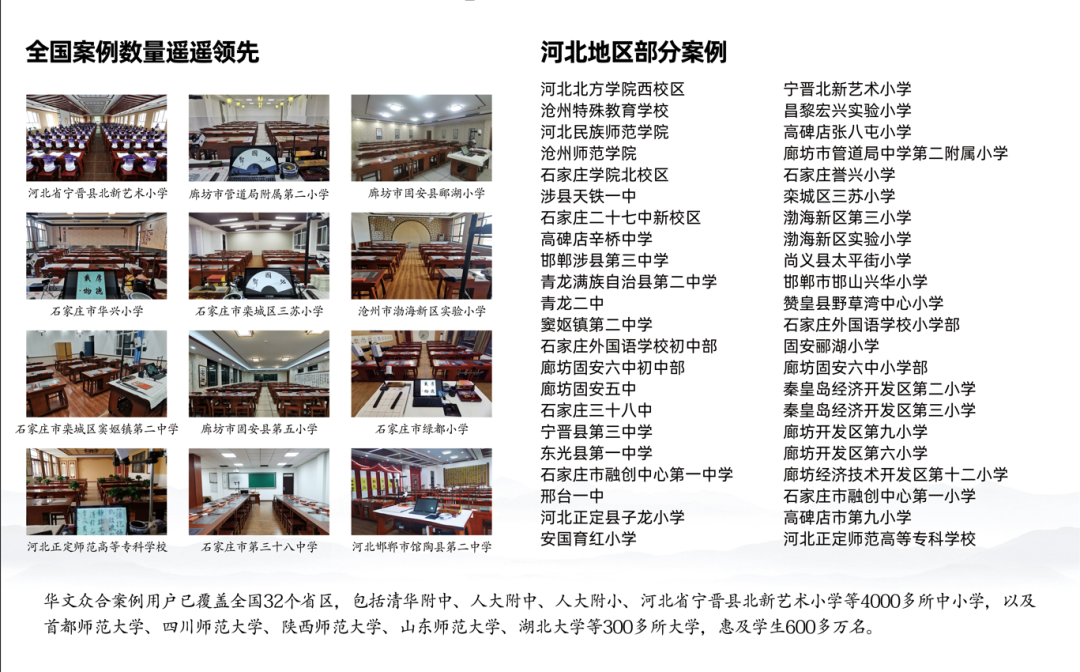 華文眾合多年來不遺余力致力于智慧書法創新,讓傳統書法文化在新時代以數字化、智能化的方式得以發揚與傳承。此次河北教育裝備展,華文眾合第8代智慧書法教室、智慧粉筆教室的出彩表現讓我們看到了書法教育現代化的新希望。華文眾合始終在智慧書法領域不斷研發創新,為師生做好書法教育服務工作,實現助力書法教育高質量發展。目前,華文眾合智慧書法教室案例數量覆蓋全國32個省區4000多所中小學、300多所大學,其中包括清華大學附屬中學、中國人民大學附屬中學、中國人民大學附屬小學、首都師范大學等名校,惠及學生600多萬名。