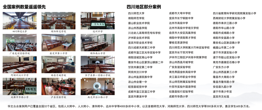 “雙減”之下,學校和社會都要為學生的全面發展撐起一片天。書法教育作為素質教育里的賽道之一,自然成為學校發展優質課后服務的焦點。華文眾合智慧書法教室使傳統與科技相結合,既注重技術的先進性,又注重教學的先進性。也正是因為這些理念,讓華文眾合的產品在此次四川教育博覽會上大放異彩,獲得廣大校長、老師等教育界人士的一致好評和認可。目前,華文眾合的智慧書法教室已經覆蓋全國32個省市及自治區,有4000多所中小學案例、300多所高校案例,其中包括清華大學附屬中學、中國人民大學附屬中學、中國人民大學附屬小學、首都師范大學等名校,惠及學生600多萬名。