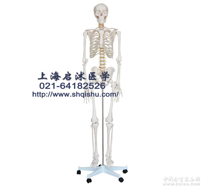 這款經濟型的、真人大小的、關節相連的塑料模型是基礎解剖教學的理想模型,物美價廉。手臂和腿部可拆下供研究。顯示神經分支、脊椎動脈和腰椎間盤等。頭顱含可活動的下巴、可移動的頭顱蓋、骨縫線。 人體骨骼模型的構造: (一)頭顱骨:由22塊頭骨組成整顱,顱蓋橫切,取去后示顱內諸結構,下頜骨可以活動。 (二)脊柱:由七個頸椎,十二個胸椎,五個腰椎,一塊骶骨,一塊尾骨及廿三個椎間軟骨組成。并示頸、胸、腰、骶四個生理彎曲。 (三)胸廓:由24塊肋骨、一塊胸骨,肋軟骨與脊椎胸椎部分連接,構成胸廓。 (四)骨盆:由骶骨、尾骨和兩塊髖骨組成。 (五)上肢骨:由64塊骨組成,肩帶部分的肩胛骨和鎖骨固定在胸廓上,上肢的游離都可拆卸,肩、肘、腕等關節均可自由活動。 (六)下肢骨:由62塊骨組成,下肢帶固定構成骨盆,下肢游離都可以拆卸,髖、膝等關節均可自由活動。 人體骨骼模型安放在牢固的16英寸金屬架上。用PVC制成,可水洗,不破碎,附防塵罩 尺寸: 180CM。 包裝: 90x41x25CM, 1件/箱, 12KG 友情提示: 您只要致電:021-64182526 我們可以幫您推薦符合您要求的人體骨骼模型(高180cm)相關產品!