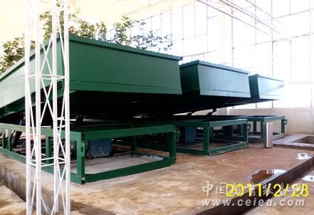 經初步設計,試驗,擬采用鋼槽體、槽體機架兩大部件方式,鋼槽中部絞結在槽體機架中軸上,搖柄連接絲杠移動槽體中軸上部附近,使槽體沿槽體機架中軸轉動,進而形成鋼槽坡度變化