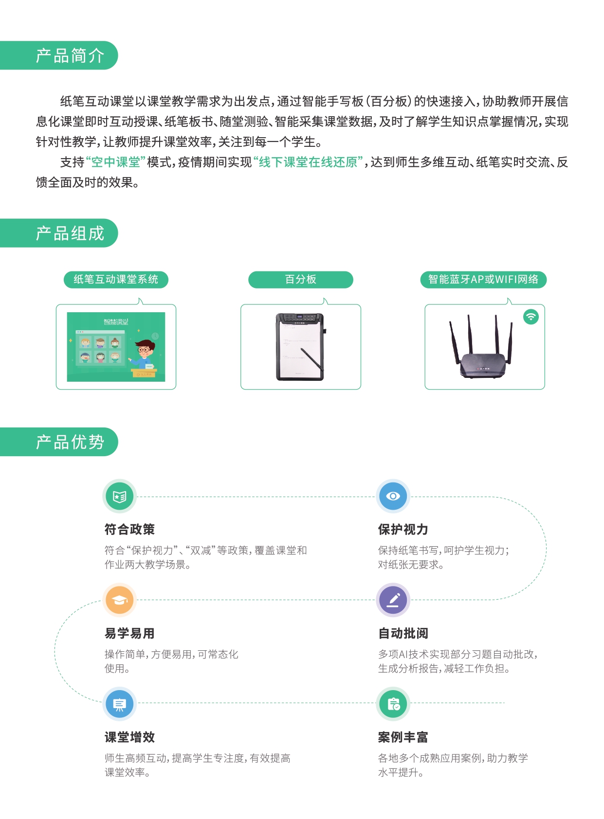 紙筆互動課堂以課堂教學需求為出發點,通過智能手寫板(百分板)的快速接入,協助教師開展信息化課堂即時互動授課、紙筆板書、智能采集課堂數據,及時了解學生知識點掌握情況,實現針對性教學,讓教師能關注到每一個學生。教學授課:支持PPT授課、導學案授課等多種授課模式。隨堂練習:PPT截屏發布練習、導學案練習進行教學互動。隨堂測驗:導學案拆題練習,當堂點評學生卷面,答題報告即時分析。隨堂聽寫:智能識別、播放聽寫內容,自動識別卷面判分。自動批閱:填空題智能識別答題字跡,自動批閱。對比講評:學生答題同屏呈現,教師可對比講評。紙筆板書:省時省力無粉塵,場地及版面不受限。