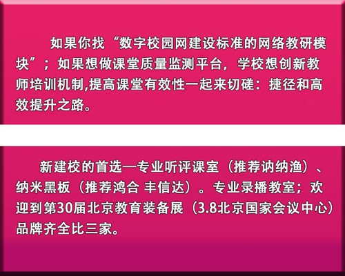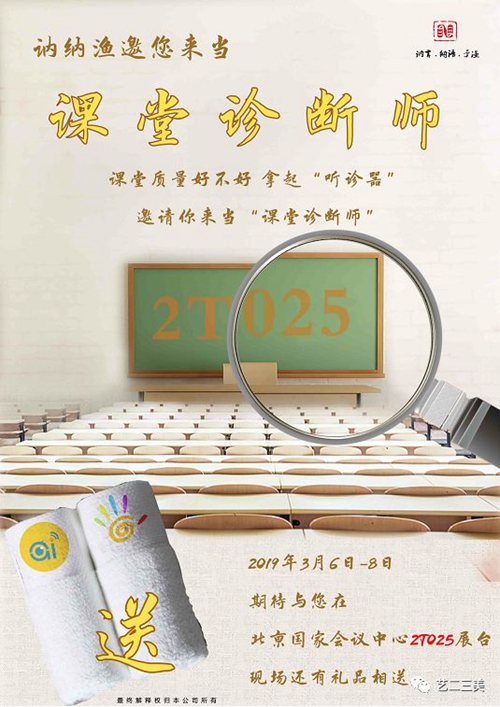 第30屆(2019年)北京教育裝備展示會(huì)暨北京教育裝備論壇將于2019年3月6日至8日在國(guó)家會(huì)議中心召開。另,展會(huì)期間,訥納漁展位還為現(xiàn)場(chǎng)參與評(píng)課的“診斷師”準(zhǔn)備了小驚喜,期待您的光臨!