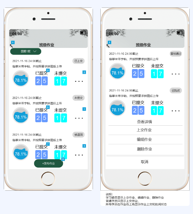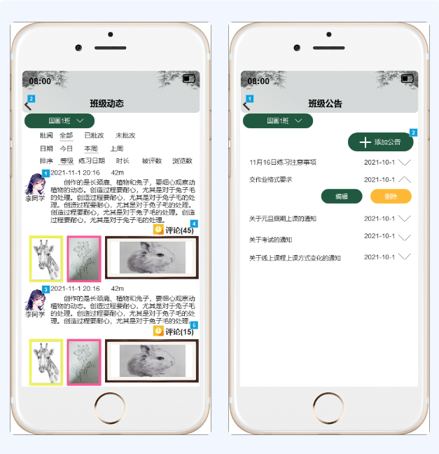 直播包括教室端和學生端,通過登錄、幫助、關于常見問題、問題詳情、意見反饋、校園美育、美育詳情、發布作業、班級作業列表、作業批閱(作業核查)、每日書畫列表、每日書畫詳情評論等利用直播的方式呈現出來;并方便老師批改作業而完成老師和學生的互動。