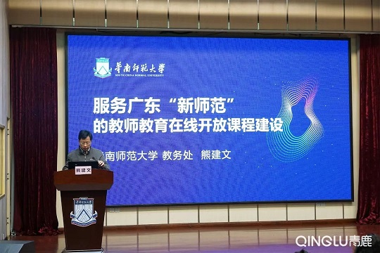 在主題為《服務廣東“新師范”的教師教育在線開放課堂建設》的演講中,熊建文教授認為,互聯網是課程創新的一大要素。要融入互聯網思維,深化教師教育課程改革,進一步優化新時代大國良師培養方案。熊教授還進一步分享了華南師范大學是如何通過機制保障、資源建設、配套服務、創新應用等方式,推進教師教育在線開放課堂的建設。