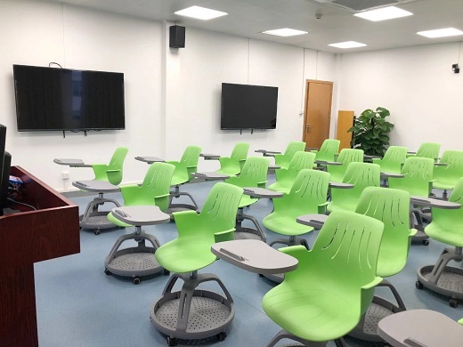 教室前方兩個拼接大屏和兩個顯示屏,在左右兩邊分別設有3個小組顯示屏。課桌椅接可自由移動和拼接,可分排分列布置或環繞形成小組。