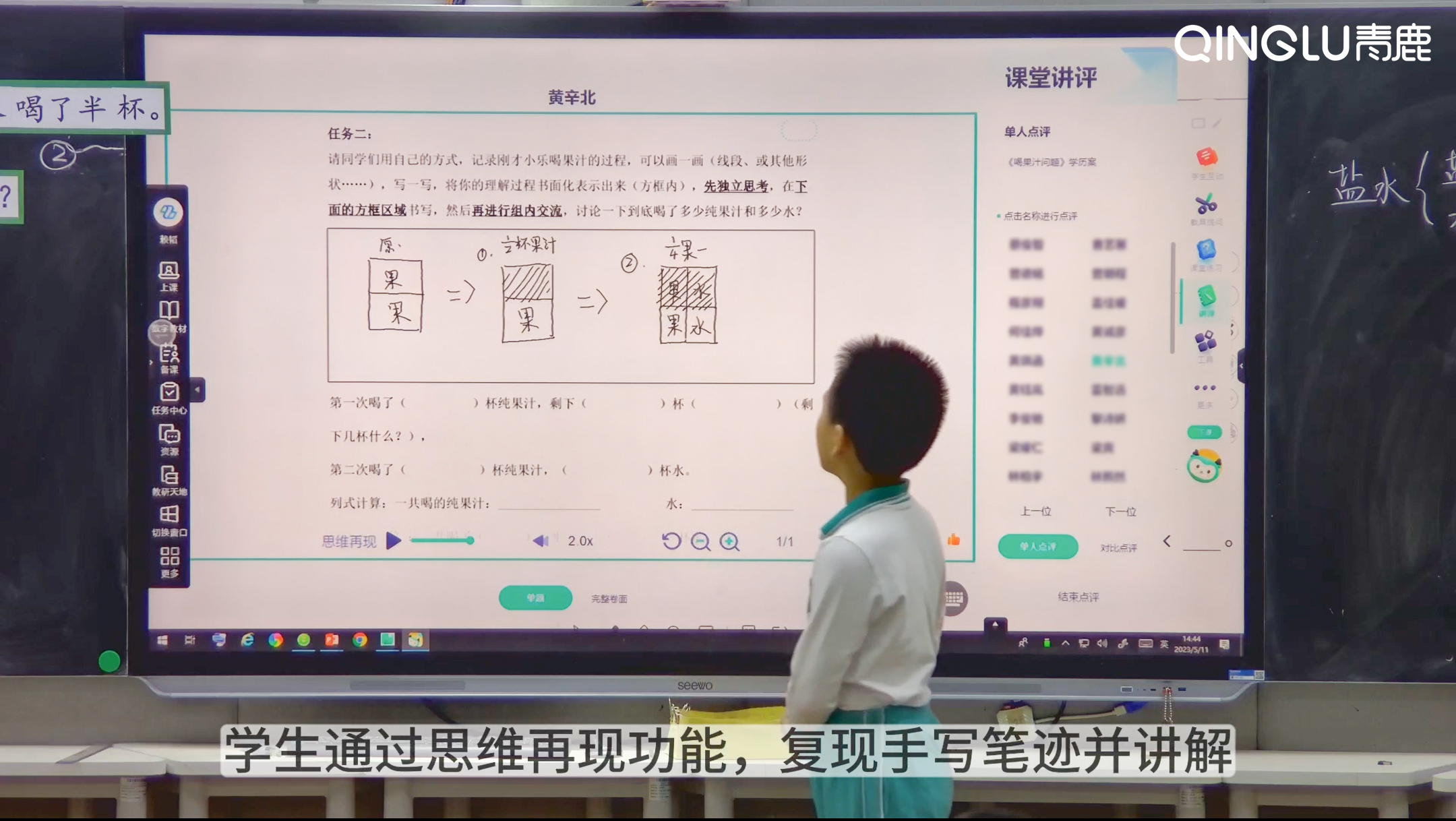 在廣東省廣州市天河區體育東路小學興國學校五年級數學《喝果汁問題》的課堂教學中,師生借助青鹿智慧紙筆系統完成“閱讀與理解、分析與解答、回顧與反思”全過程應用,以課堂多樣化互動與探究活動反饋,促進學習目標達成。