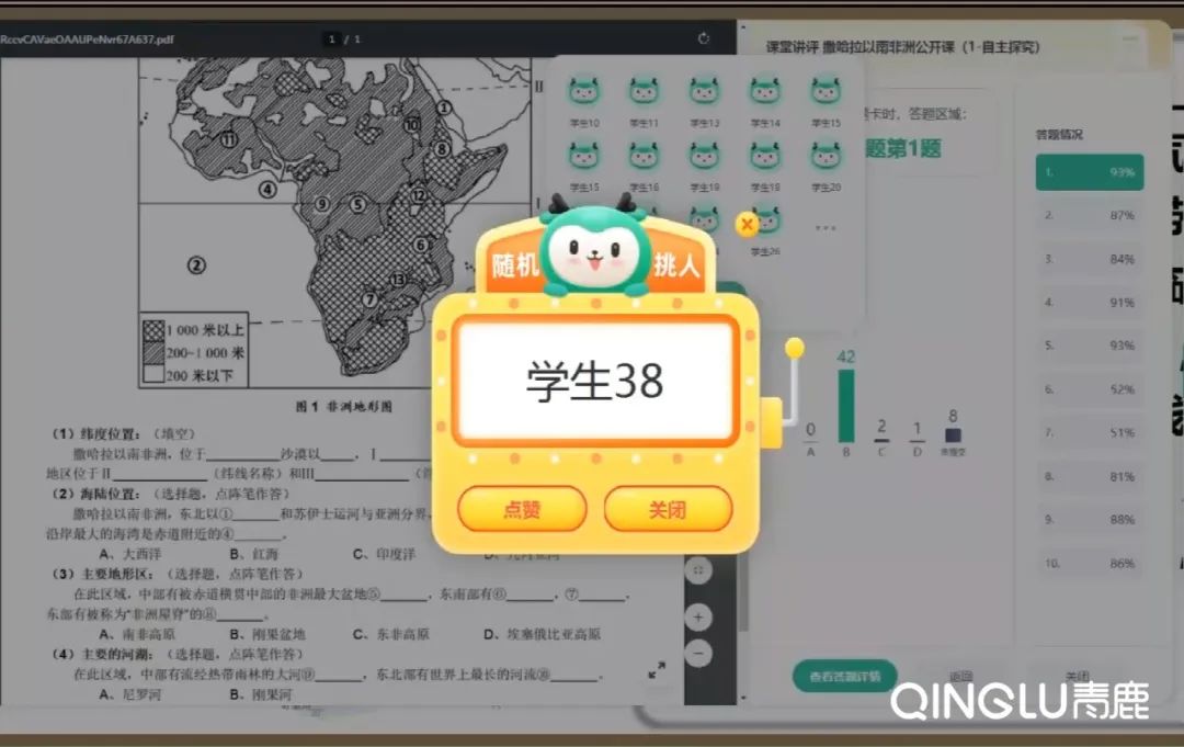 在課例的自主學習環節,學生在使用青鹿智能筆完成自習單后,教師運用青鹿智慧紙筆系統進行隨機挑人,針對學生的答題情況進行問答引導,以及時發現學生的思維卡點,幫助學生建構出地理區域分析的基本思維框架,提高課堂互動效率,營造良好的溝通氛圍。
