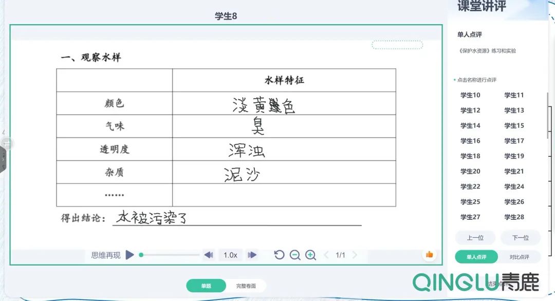 在活動探究時,學生使用青鹿智能筆記錄實驗過程與探究結果,數據實時傳輸至一體機大屏顯示,林老師能及時了解學生們的實驗情況,更有針對性地講解知識點與解答問題。