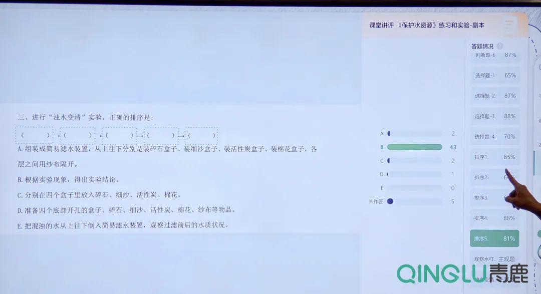 課程尾聲,林老師通過青鹿智慧紙筆系統下發練習題,幫助學生及時鞏固知識、發現學習薄弱點。系統將自動批改客觀題,并即時統計正確率,班級學情一目了然。