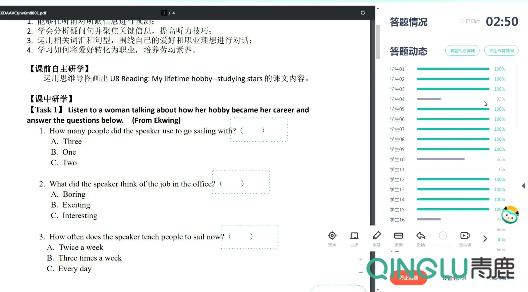 課中,老師在完成課程知識講授后,通過青鹿智慧紙筆系統,布置選擇題聽力任務等練習,及時了解學生掌握情況的效果,鞏固學生對所學知識的理解。