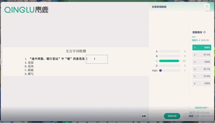 在課堂導入環節,劉老師運用青鹿智慧紙筆系統下發了“課堂測驗”,以檢測學生在課前預習中對文言文生字詞的掌握情況,通過系統反饋實時查看學生的作答進度與詳情,合理把控課堂教學節奏。