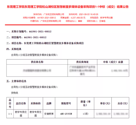 近期,東莞理工學(xué)院松山湖校區(qū)智慧教室多媒體設(shè)備采購項(xiàng)目進(jìn)行公開招標(biāo),安道教育成功中標(biāo)此項(xiàng)目,為東莞理工建設(shè)高水平理工科大學(xué)提供強(qiáng)力技術(shù)支撐。