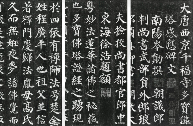 《多寶塔碑》用筆豐厚遒美,腴潤沉穩(wěn);橫細(xì)豎粗,對比強烈;結(jié)體嚴(yán)謹(jǐn)致密,緊湊規(guī)整,平穩(wěn)勻稱。學(xué)顏體者多從此碑入手,入其堂奧。