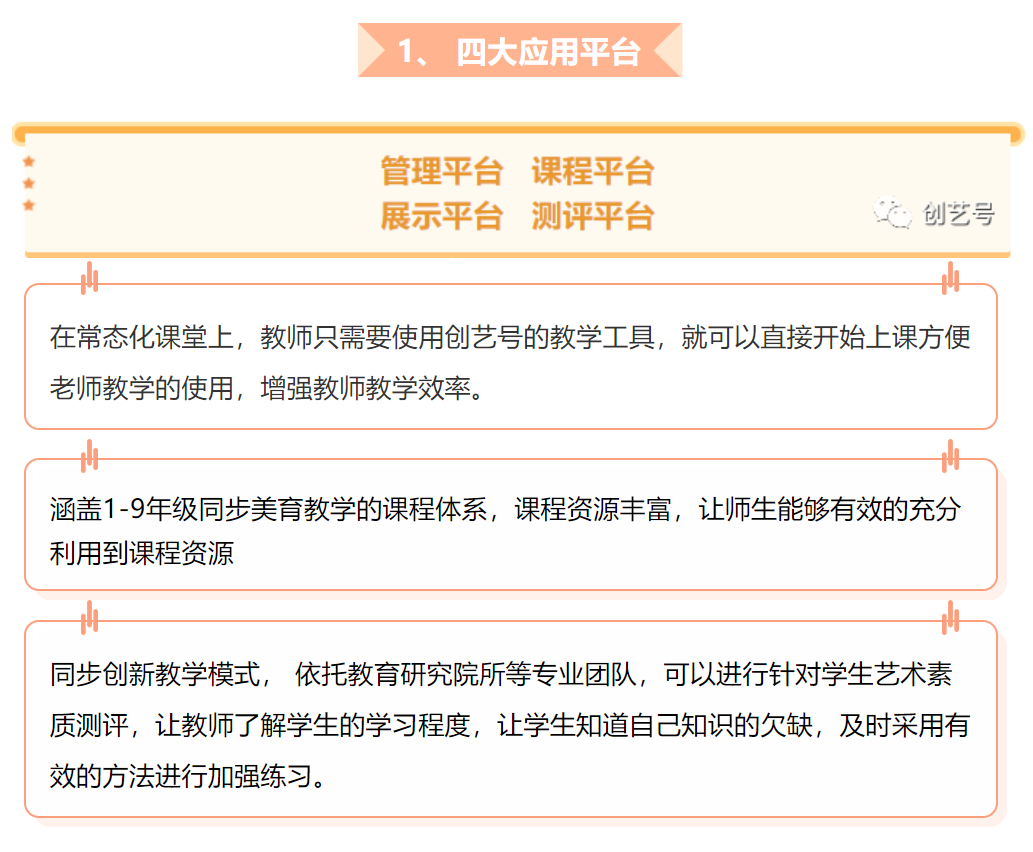 區域美育整體解決方案。創藝號美育綜合建設方案,做到“三建設,三提升”,建設美育創新型課程模式,提升區域整體教學能力;建設美育發展性評價體系,提升學生藝術綜合素養;建設美育專業化場地課程,提升學校優質特色發展,有效服務美育進校園、進中考。