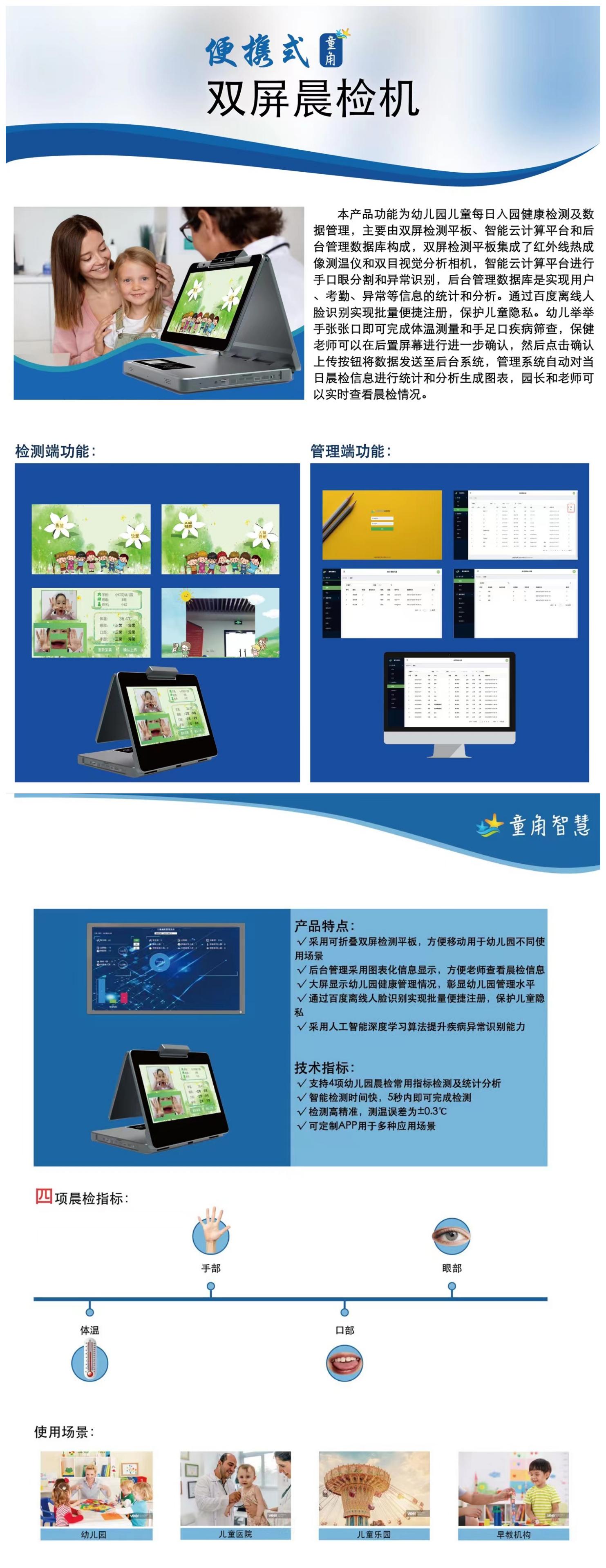 產品詳細介紹本產品功能為幼兒園兒童每日入園健康檢測及數據管理,主要由雙屏檢測平板、智能云計算平臺和后臺管理數據庫構成,雙屏檢測平板集成了紅外線熱成像測溫儀和雙目視覺分析相機,智能云計算平臺進行手口眼分割和異常識別,后臺管理數據庫是實現用戶、考勤、異常等信息的統計和分析。通過百度離線人臉識別實現批量便捷注冊,保護兒童隱私。幼兒舉舉手張張口即可完成體溫測量和手足口疾病篩查,保健老師可以在后置屏幕進行進一步確認,然后點擊確認上傳按鈕將數據發送至后臺系統,管理系統自動對當日晨檢信息進行統計和分析生成圖表,園長和老師可以實時查看晨檢情況 產品特點: √ 采用可折疊雙屏檢測平板,方便移動用于幼兒園不同使用場景后臺管理 √ 后臺管理采用圖表化信息顯示,方便老師查看晨檢信息 √ 可以大屏顯示幼兒園健康管理情況,彰顯幼兒園管理水平 √ 采用百度人臉識別實現批量用戶注冊,保護用戶隱私 √ 采用人工智能深度學習算法提升疾病異常識別能力 技術指標: √ 支持4項幼兒園晨檢常用指標檢測及統計分析 √ 智能檢測時間快,5秒內即可完成檢測 √ 檢測高精準,測溫誤差為±0.3℃ √ 可定制APP用于多種應用場景 |