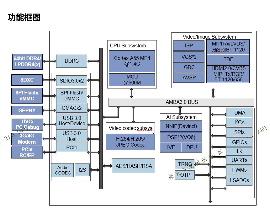 − 輸入2路3840x2160,輸出4320x3840 − 輸入4路2688x1520,輸出6080x2688 支持視頻層、圖形層疊加 支持色彩空間轉換 視頻輸出 支持 HDMI2.0 接口輸出 支持 4-Lane Mipi DSI/CSI 接口輸出,最高 2.5Gbps/lane 內置模擬標清 CVBS 輸出 支持 8/16/24 bit RGB、BT.656、BT.1120 等數字接口 同時支持 2 個獨立高清視頻輸出 − 支持任意兩種接口非同源輸出 − 其中一路可支持PIP(Piture In Piture) 最大輸出能力 4096x2160@60fps + 1920x1080@60fps 音頻接口與處理 內置 Audio codec,支持 16bit 語音輸入和輸出 支持 I2S 接口 − 支持多聲道時分復用傳輸模式(TDM) 支持 HDMI Audio 輸出 通過軟件實現多協議語音編解碼 支持音頻 3A(AEC/ANR/ALC)處理 支持 G.711/G.726/AAC/等音頻編碼格式 安全隔離與引擎 支持安全啟動 支持基于 TrustZone 的 REE/TEE 硬件隔離方案 硬件實現 AES 對稱加密算法 硬件實現 RSA2048/3072/4096 簽名校驗算法 硬件實現基于 HASH 的 SHA/256/384/512、HMAC_SHA256/384/512 算法 硬件實現隨機數發生器 集成 30Kbit OTP 存儲空間供客戶使用 網絡接口 2 個千兆以太網接口 − 支持RGMII、RMII兩種接口模式 − 支持TSO、UFO、COE等加速單元 − 支持Jumbo Frame 外圍接口 支持上電復位(POR)和外部輸入復位 集成 4 通道 LSADC 多個 UART、I2C、SPI、GPIO 接口 2 個 SDIO3.0 接口 − SDIO0支持SDXC卡,最大容量2TB − SDIO1支持對接wifi模組 2 個 USB3.0/USB2.0 接口 − USB0 僅Host接口 − USB1 Host/Device可切換 2-Lane PCIe2.0 高速接口 − 支持RC/EP模式 − 可配置為2-Lane PCIe2.0 − 可配置為1-Lane PCIe2.0 + USB3.0 外部存儲器接口 DDR4/LPDDR4/LPDDR4x 接口 − 支持4 x 16bit DDR4 − 支持2 x 32bit LPDDR4/LPDDR4x − DDR4最高速率3200Mbps − LPDDR4/LPDDR4x最高速率3733Mbps − 最大容量8GB SPI Nor/SPI Nand Flash 接口 − 支持1、2、4線模式 − SPI Nor Flash支持3Byte、4Byte 地址模式 NAND Flash 接口 − 支持SLC、MLC異步接口器件 − 支持2/4/8/16KB頁大小 − 支持8/16/24/28/40/64bit ECC(以1KB為單位) eMMC5.1 接口,最大容量 2TB 可選擇從 eMMC、SPI Nor/SPI Nand Flash、 NAND Flash 或 PCIe 從片啟動 SDK Arm CPU 支持 Linux SMP DSP/MCU 支持 LiteOS 芯片物理規格 功耗 − 5.2W典型功耗(4K30 + 4Tops) 工作電壓 − 內核電壓為0.8V − IO電壓為1.8/3.3V − DDR4/LPDDR4/LPDDR4x接口電壓分別為1.2/1.1/0.6V 封裝形式 − RoHS,FC-BGA 23mm x 23mm封裝 − 管腳間距:0.65mm |