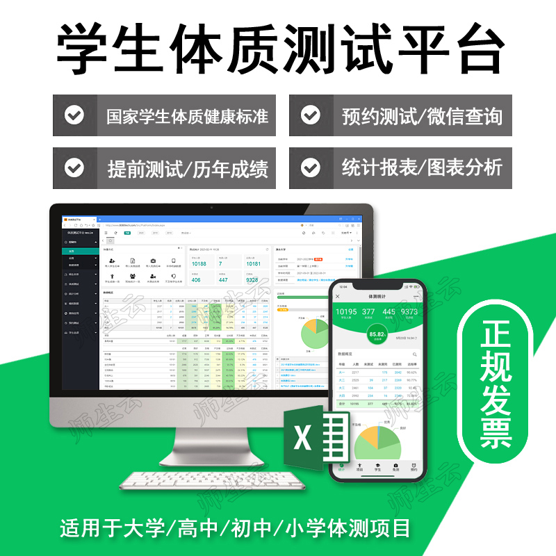 ①學生成績管理 學生成績一覽(可按院系/班級/學年/測試狀態(tài)篩選) 行政班統(tǒng)計一覽(可按院系/專業(yè)/學年篩選) 體育班統(tǒng)計一覽(可按體育班/教師/學年/測試狀態(tài)篩選) 成績等級一覽(可按優(yōu)良中差等級及院系/學年/測試狀態(tài)篩選) ②免予測試管理 免測名單管理(審核通過/駁回/清空) 批量添加名單、批量審核處理(可微信推送通知) 導入/導出免測名單Excel ③數(shù)據(jù)導入/導出 導入/導出體測數(shù)據(jù)Excel(可按行政班/體育班;可按單項/合并項導入) 接收手持機實時傳輸數(shù)據(jù) 可接收測試儀實時傳輸數(shù)據(jù) 導入手持機數(shù)據(jù) ④數(shù)據(jù)統(tǒng)計分析 當前數(shù)據(jù)概覽(測試人數(shù)統(tǒng)計、各測試項目的達標人數(shù)統(tǒng)計等) 按測試項目統(tǒng)計(可按院系/專業(yè)/學年篩選) 按年級統(tǒng)計(可按院系/專業(yè)/學年篩選) 按院系、專業(yè)、行政班、體育班統(tǒng)計) 圖形分析-達標率占比分析(可按院系/專業(yè)/學年篩選) 圖形分析-各年級對比分析(可按院系/專業(yè)/學年篩選) 圖形分析-測試項目分析(可按院系/專業(yè)/學年篩選) 圖形分析-歷年對比分析(可按院系/專業(yè)/學年篩選) ⑤數(shù)據(jù)上報 篩查身份證異常 學校測試環(huán)境設置 生成上報文件Excel(剔除未測試/免測等不符合上報的部分) ⑥學生端 體測成績查詢(含歷年體測成績) 運動處方 免予測試申請(可上傳照片、審核前二次編輯/撤消) 預約測試申請 體育選課 修改密碼、修改頭像、找回密碼
