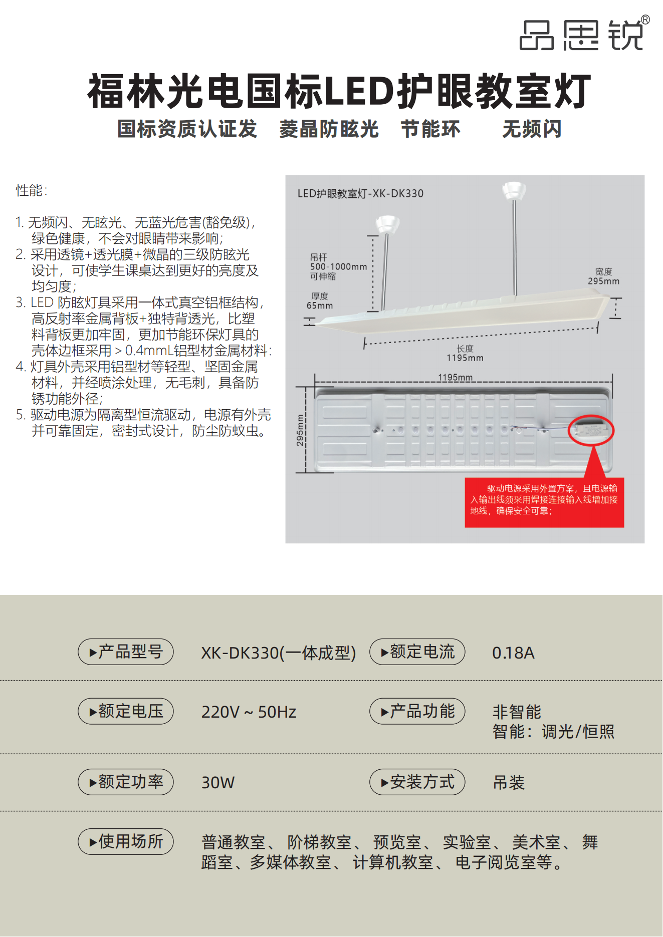產品詳細介紹性能: 1. 無頻閃、無眩光、無藍光危害(豁免級), 綠色健康,不會對眼睛帶來影響; 2. 采用透鏡+透光膜+微晶的三級防眩光 設計,可使學生課桌達到更好的亮度及 均勻度; 3. LED 防眩燈具采用一體式真空鋁框結構, 高反射率金屬背板+獨特背透光,比塑 料背板更加牢固,更加節能環保燈具的 殼體邊框采用>0.4mmL鋁型材金屬材料: 4. 燈具外殼采用鋁型材等輕型、堅固金屬 材料,并經噴涂處理,無毛刺,具備防 銹功能外徑; 5. 驅動電源為隔離型恒流驅動,電源有外殼 并可靠固定,密封式設計,防塵防蚊蟲。 |