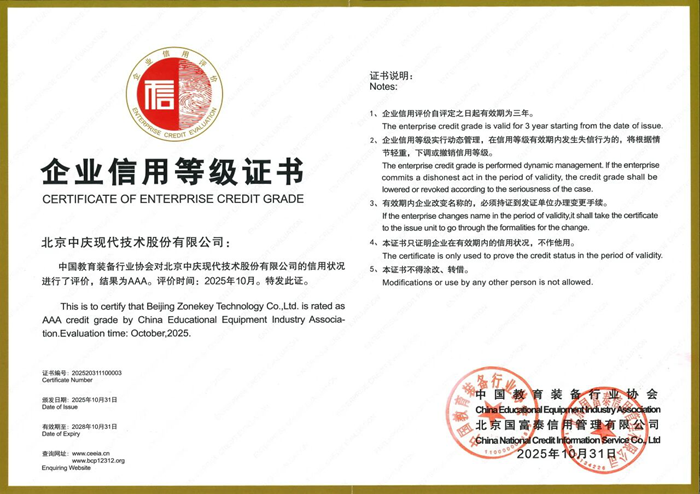 企業信用等級評價是衡量企業綜合信用水平的重要指標,其中AAA評級,是行業內對企業經營狀況、財務信用、管理能力、社會聲譽及履約能力等多個維度進行全面、嚴格評估后授予的最高榮譽�,F代中慶連續維持AAA評級,不僅是公司多年來穩健經營、誠信為本的有力證明,更是對公司在教育裝備領域持續創新、優質服務的肯定。