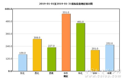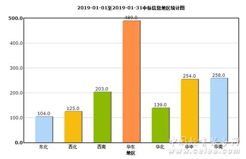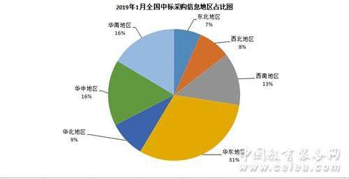 從1月中標(biāo)信息地區(qū)統(tǒng)計圖(如圖8所示)和全國中標(biāo)信息地區(qū)占比圖(如圖9所示)來看:華東地區(qū)中標(biāo)信息量為489條,占比31%;華南地區(qū)中標(biāo)信息量為258條,占比16%;華中地區(qū)中標(biāo)信息量為254條,占比16%;西南地區(qū)招中標(biāo)信息量為203條,占比13%;華北地區(qū)中標(biāo)信息量為139條,占比9%;西北地區(qū)中標(biāo)信息量為125條,占比8%;東北地區(qū)中標(biāo)信息量為104條,占比7%。