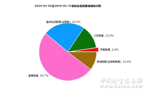 從1月招標(biāo)采購信息所屬領(lǐng)域統(tǒng)計圖(如圖6所示)上看,學(xué)前教育占比為2.4%;義務(wù)教育占比為13.2%;高中階段教育(含職教)占比為23.3%;高等教育占比為50.7%;其他教育(含特殊教育)占比為10.4%。