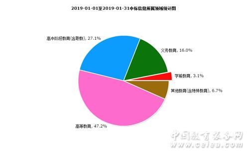 1月中標(biāo)信息所屬領(lǐng)域統(tǒng)計圖,如圖10所示:學(xué)前教育占比為3.1%;義務(wù)教育占比為16.0%;高中階段教育(含職教)占比為27.1%;高等教育占比為47.2%;其他教育(含特殊教育)占比為6.7%。